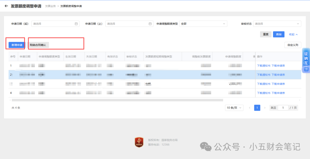 6、提交申请:完成信息填写和附件上传后,点击【申请】按钮,提交成功后等待主管税务机关工作人员审核,审核完成后即可完成发票额度调整。
