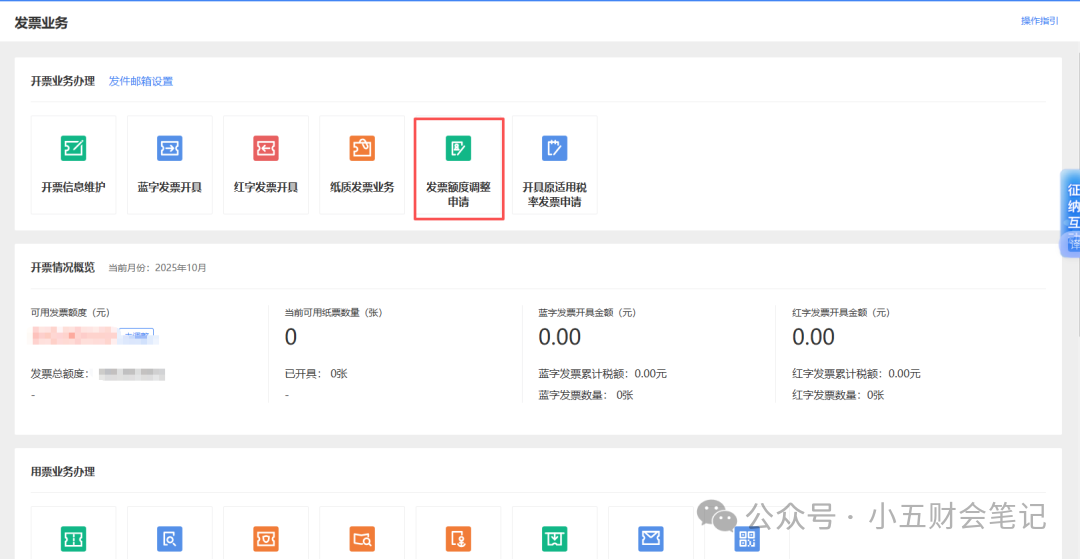 2、进入发票额度调整申请界面:通常有两种渠道,一是点击【开票业务办理】-【发票额度调整申请】;二是点击【开票情况概览】-【可用发票额度】右侧的 “去调整”。