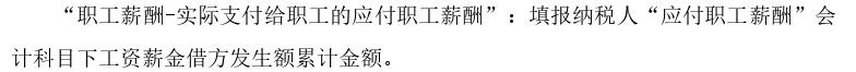 填表说明里说了,填报纳税人“应付职工薪酬”会计科目下工资薪金借方发生额累计金额,依旧是会计核算口径的数值,“应付职工薪酬(二级科目)”下“工资薪金”的借方发生额累计金额,不包括职工福利费、单位承担的社保费、公积金等,和第一个口径数值是不一样的,是发放的税前工资。