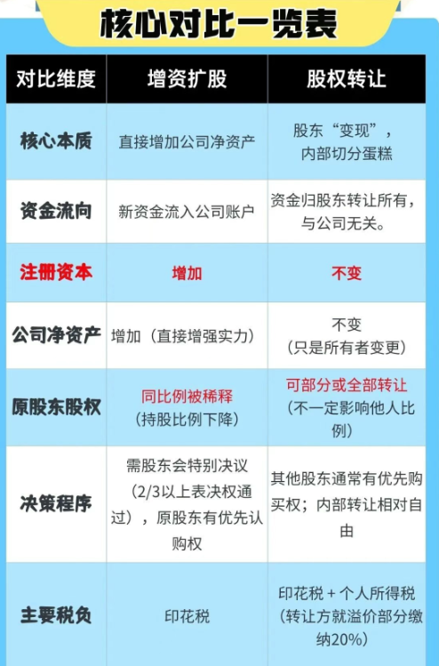 增资扩股:是做一个更大的新蛋糕。新股东带面粉(资金)来,大家一齐做个更大的,每个人手里的蛋糕分量(股权比例)虽然可能被摊薄了,但总值可能因蛋糕变大而提升。